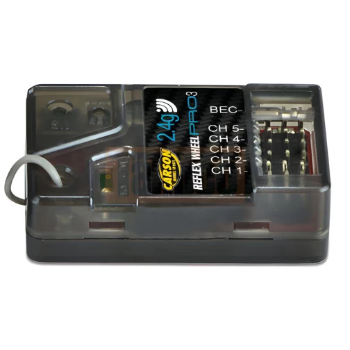 Der CARSON 5-Kanal Ergänzungsempfänger Reflex Wheel PRO wasserdicht 3 2,4 GHz mit Failsafe und BEC -Funktion passt in viele Auto- und Bootsmodelle. Seine kompakten Maße machen ihn zum idealen Begleiter in deinem Modell. Passend zum Sender Reflex Wheel Pro3 und Reflex Wheel Pro3LCD sowie Reflex Stick 2 und Reflex Stick Multi.