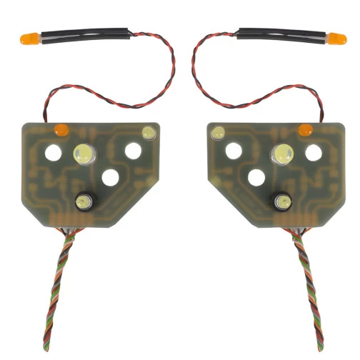 6 Lichtfunktionen: Blinker vorne, seitliche Begrenzungsleuchte mit Blinkerfunktion (wie beim Originalfahrzeug leuchtet der Blinker heller als die Begrenzungsleuchte ), Standlicht, Fahrlicht, Fernlicht und Nebelscheinwerfer. Litzenkabel (farbig) Länge von ca. 200mm.